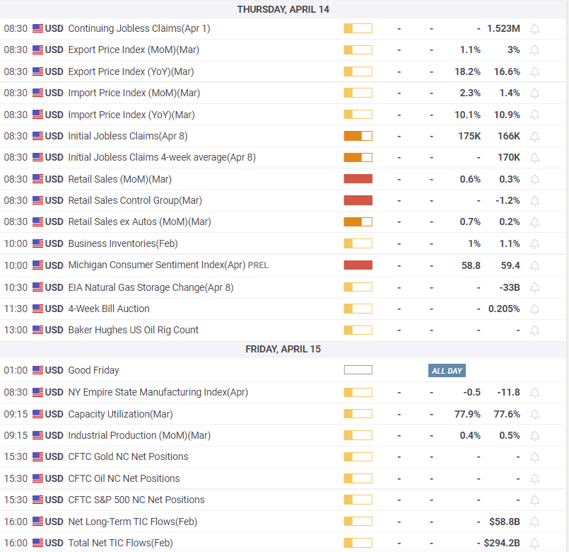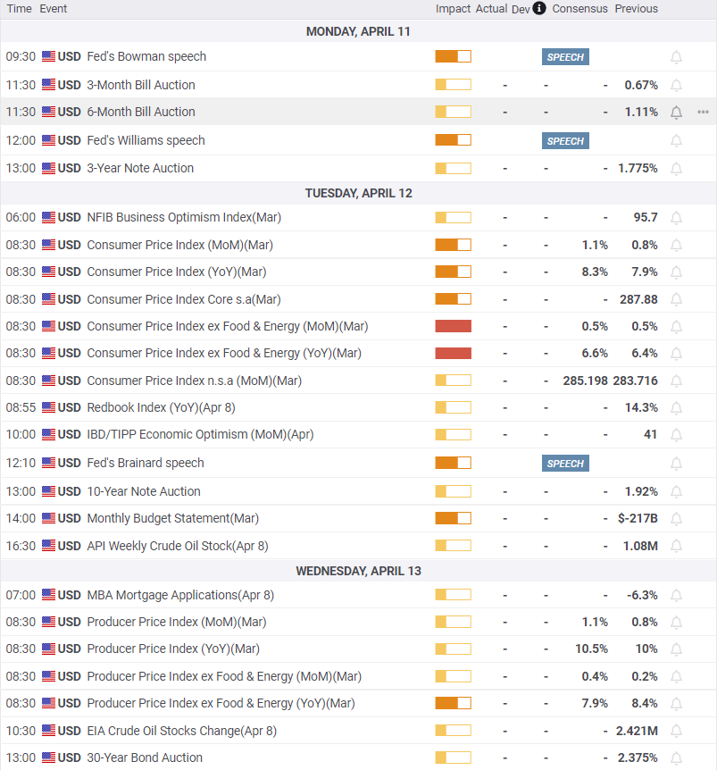 Consumer prices in the US for March on Tuesday followed by the Producer Price Index (PPI) the next day and Retail Sales and April's Michigan Consumer Sentiment on Thursday are the major data points. Inflation is forecast to rise to 8.3% from 7.9% with the core rate moving to 6.6% from 6.4%. Producer prices are predicted to rise to 10.5% overall with a decline in the core to 7.9% from 8.4%. From a policy and market perspective higher inflation is already priced. Of more interest and potential for market movement are the Retail Sales figures. If the US consumer begins to cut back on spending the Fed's rate program could become questionable. Sales were slightly weaker than expected in February, and are expected to double in March.
