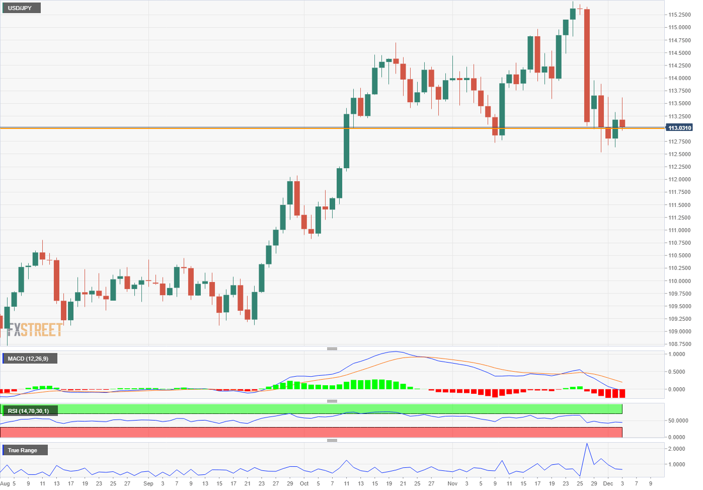 The MACD (Moving Average Convergence Divergence) cross last Friday and the widening divergence since then is a sell signal. Interestingly, the Relative Strength Index is only weakly negative for the USD/JPY. Except for the initial move last Friday, there is no momentum lower. This is clearly shown in the True Range which has sharply decreasing momentum since the move on November 26 and finished at the low point for the week. These indicators are mixed, reflecting the non-technical nature of the Friday swoon inthe USD/JPY.