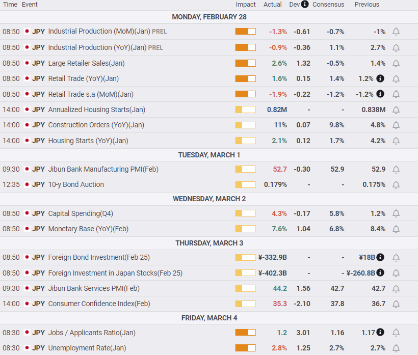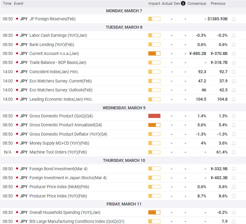 Japanese GDP for the fourth quarter is expected to rise slightly on revision to 5.6% annualized. The Business Survey Index (BSI) for the first quarter from the Ministry of Finance will give an indication of current economic conditions for Japanese businesses, as will the Eco Watchers Survey for February.