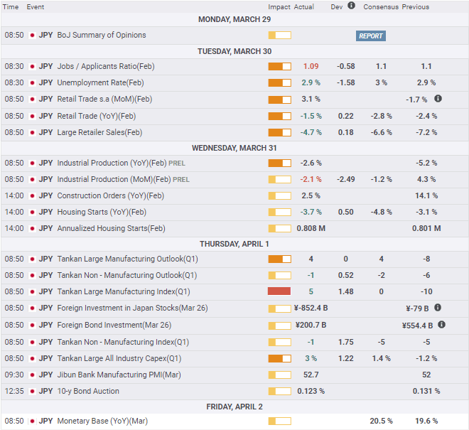 Trade Balance, Balance of Payments Basis February, January -130.1 billion yen. Consumer Confidence Index March, February 33.8. Eco Watchers Survey-Outlook March, January 51.3. Eco Watchers Survey -Current March, February 41.3.