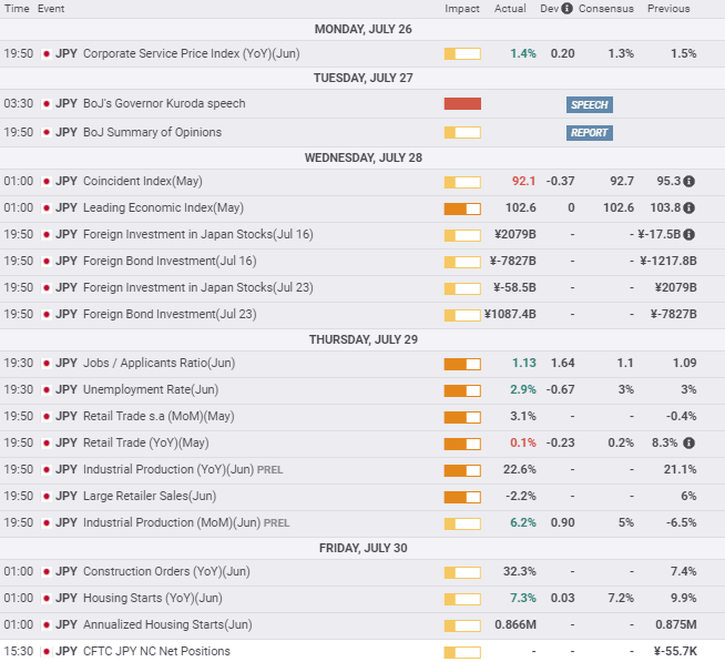 Overall Japanese Household Spending for June should continue the healthy rebound that started in March, but Japan’s economy is driven by exports not domestic consumption. Tokyo CPI, an indicator for national inflation trends, may return from eight months of deflation, but that would hardly convince markets that the Bank of Japan has succeeded in its goal of ending price declines.