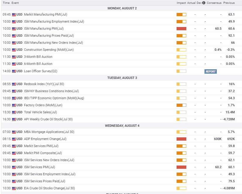 Nonfarm Payrolls for July on Friday, August 6, will order US markets with a strong result capable of giving the dollar a boost. Purchasing Managers Indexes for the service and manufacturing sectors in July could, if better than expected, revive some of the economic optimism lost to GDP.