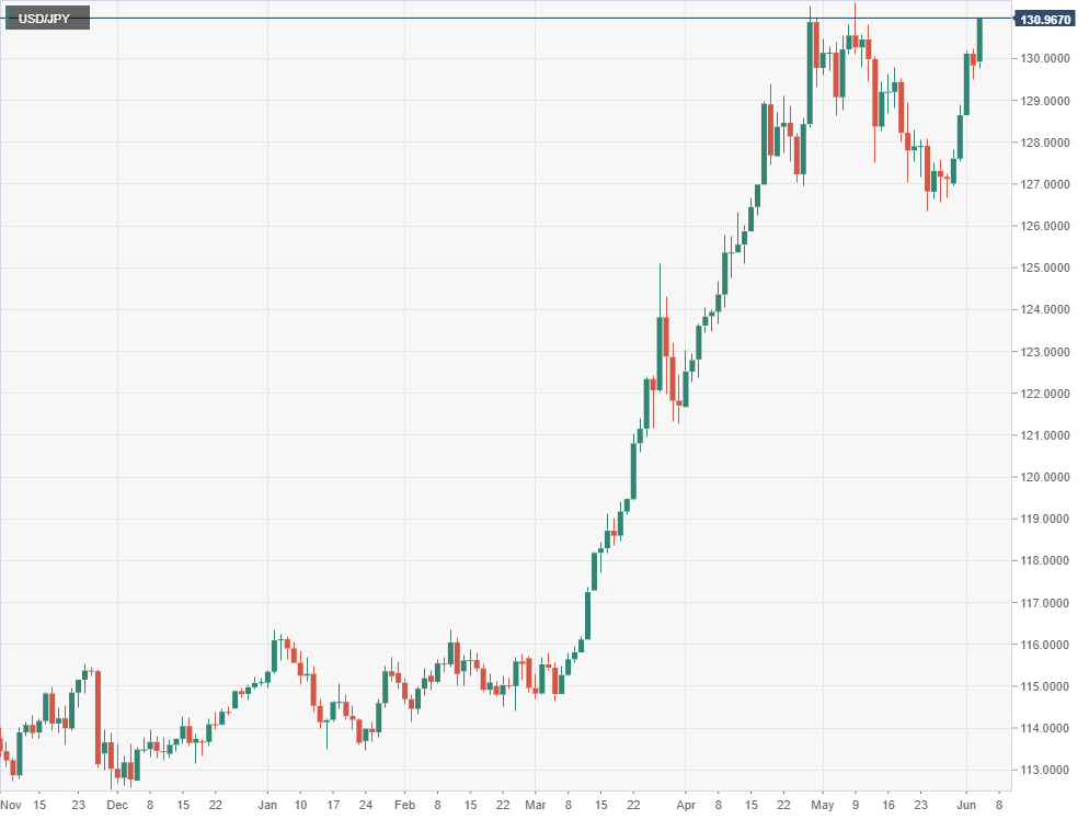 - Dollar/yen climbs above 130 for the first time in two week, adds 3.1%.