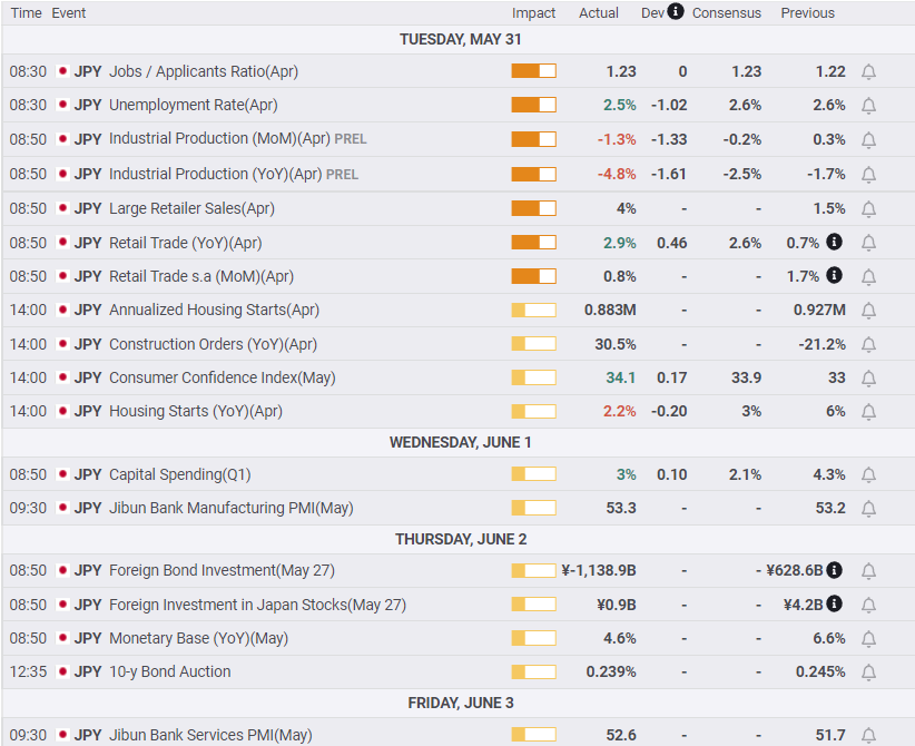 Japanese information was poor on the industrial side, with production in April considerably weaker than forecast, but better for the consumer, as Retail Trade (sales) rose for the month. Consumer confidence in May was also slightly better than anticipated.