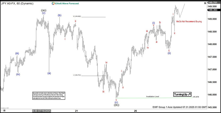 From the May 27 low, wave W concluded at 148.03. A corrective pullback in wave X then followed, which bottomed at 142.67. Currently, wave Y is in progress, with internal subdivision as a zigzag pattern. From the wave X low, wave ((a)) peaked at 149.18, followed by a corrective wave ((b)) that unfolded as a zigzag. Within this structure, wave (a) ended at 147.81 and wave (b) reached 149.08. Wave (c) completed at 145.87, finalizing wave ((b)) in the higher degree. The pair has since resumed its ascent in wave ((c)), developing as a five-wave impulse.