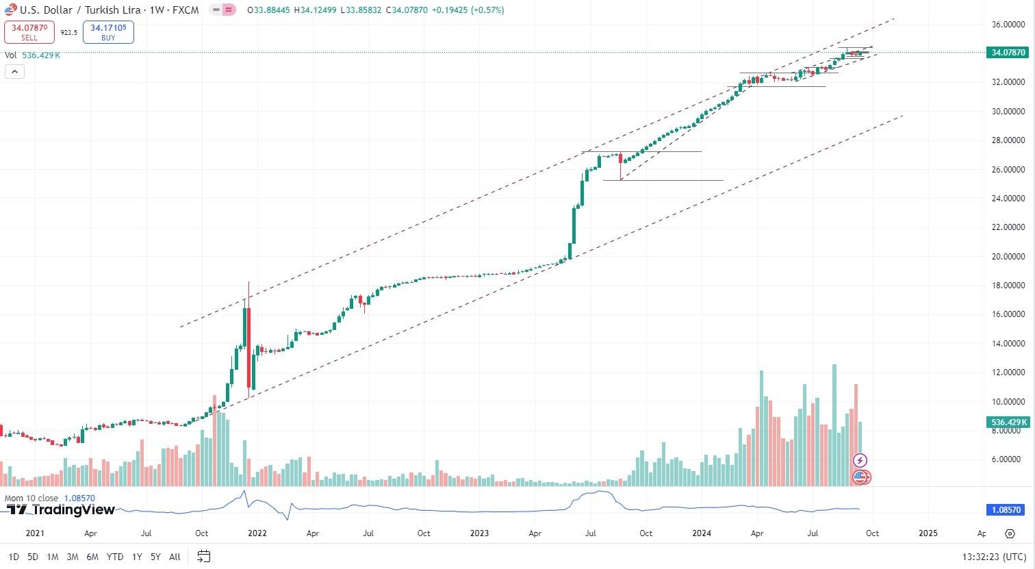 The USD/TRY pair closed at 34.078 on the FXCM platform last Friday (CBRT reference rate: 33.9531 - 34.0142). After breaking the resistance level around 33 in early August, the pair surged to a new all-time high of 34.388 on August 28. The exchange rate briefly retraced to 33.78 at the beginning of September and has been trading sideways since then, hovering near the psychological resistance of 34.