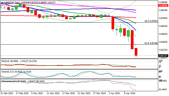 Fresh weakness broke below the floor of broader range on monthly chart that generates bearish signal of continuation of larger downtrend from parity zone (tops of Oct/Nov 2022) and exposes targets at 0.8000 (psychological) and 0.7840 (Fibo 76.4% of larger 0.7067/1.0343 uptrend).