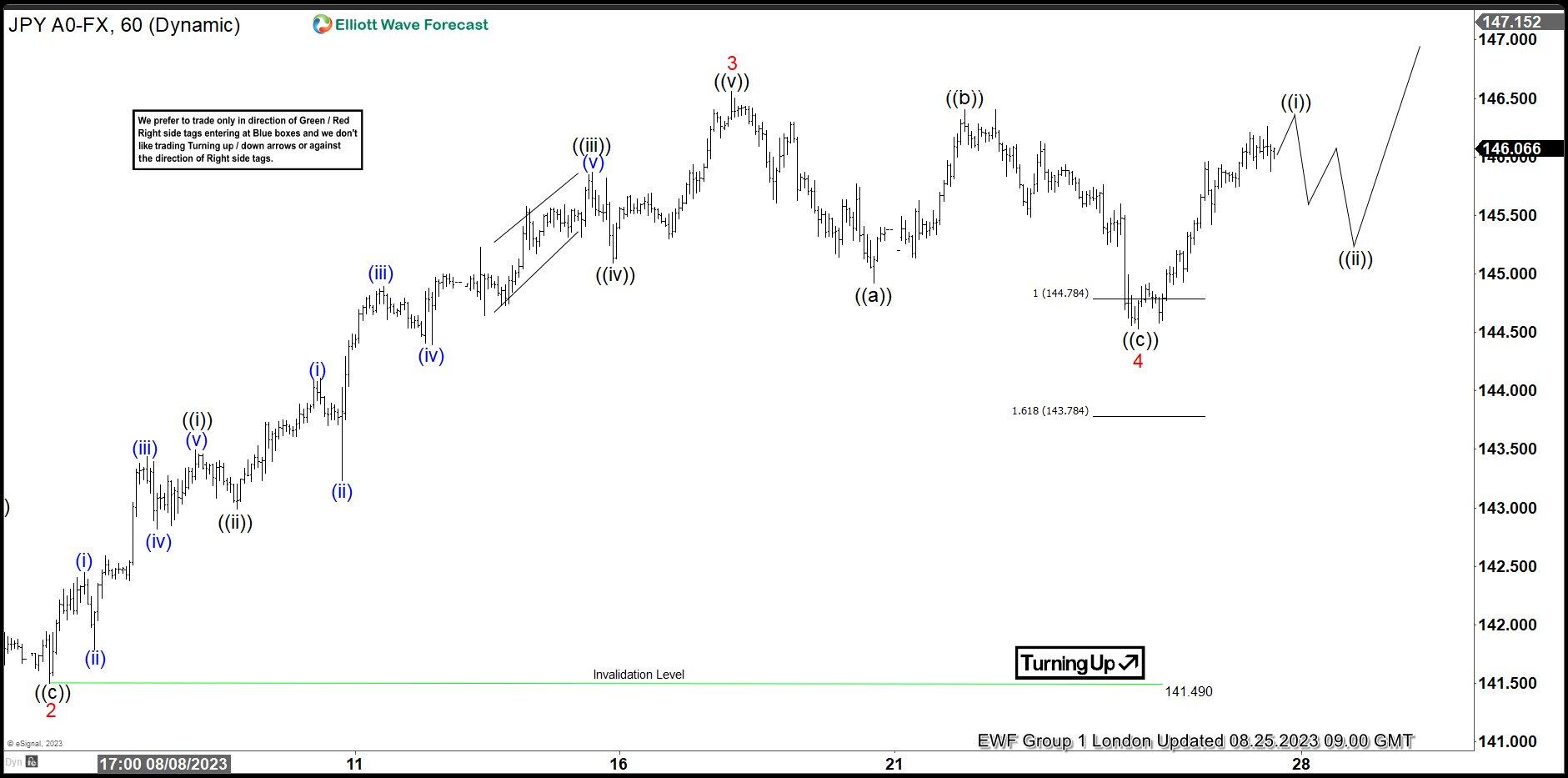 The pair has given us nice reaction from the marked zone and we count 4 red red pull back completed at 144.54 low. Now, as far as the price holds above that low we expect to see further extension higher and break above 3 red high : 08/16 to confirm next leg up is in progress. Short term we are about to end 5 waves up from the 144.54 low and then we can see a intraday pull back ((ii)) black. Once the pull back completes, next technical area to the upside should ideally come at 147.026-147.794.