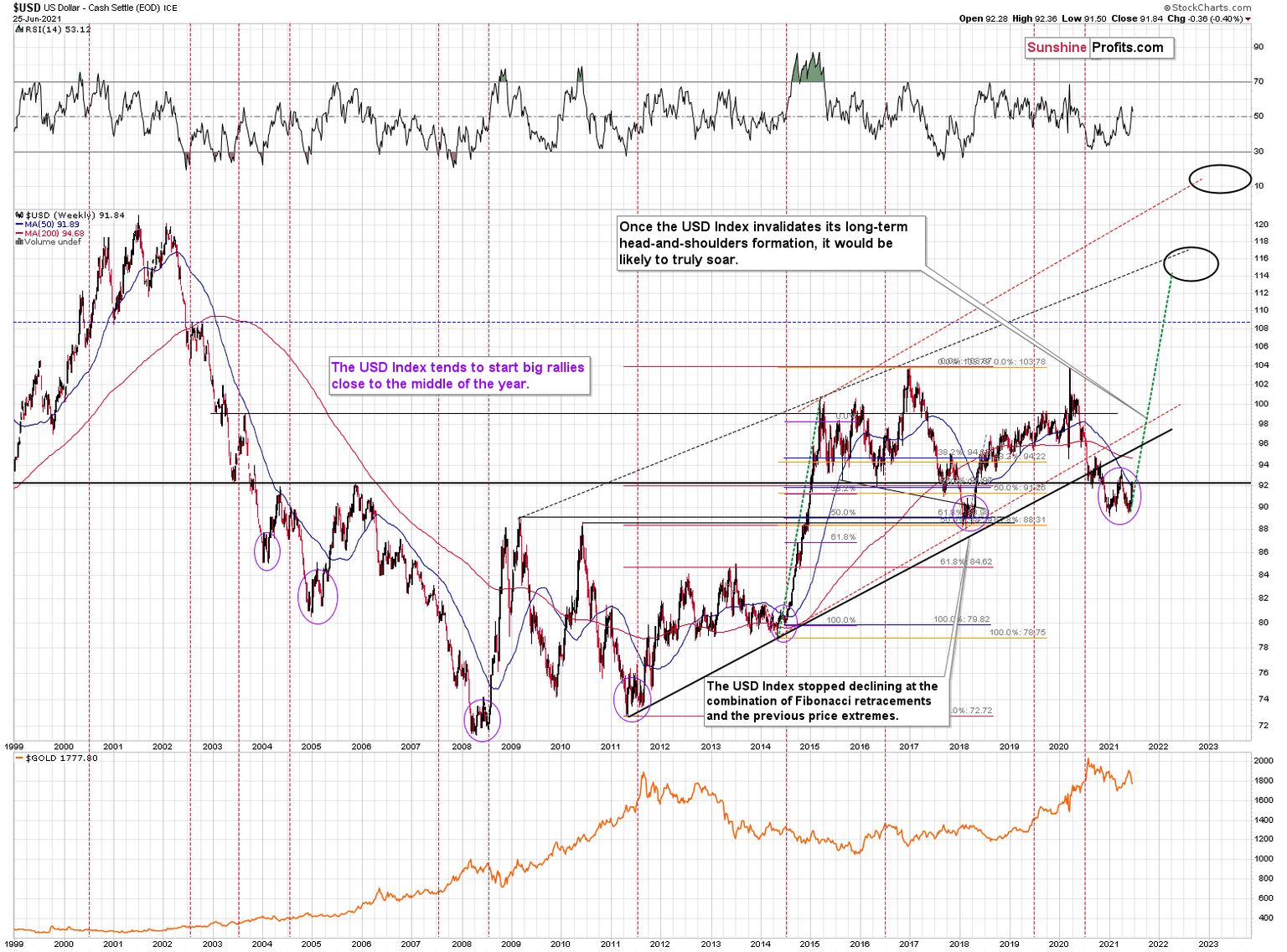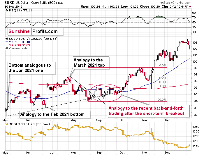 To that point, after the USD Index broke above its short-term declining resistance line in 2016, it followed that up by retreating a bit below its rising support (dashed) line and then consolidated for about a month before rallying sharply. In the process, the USD Index corrected to approximately its 38.2% Fibonacci retracement level before rallying once again (in fact, it moved slightly below it). For context, there was also a huge intraday reversal in the following days, but it was an event-driven one (it was when Donald Trump won the elections), so it’s unlikely to be repeated. As of today, with the 38.2% Fibonacci retracement level at about 91.3, the USDX could bottom close to this level. Now, this might not seem like a big deal, but it becomes quite important once one considers what happened in gold during the final part of the move to the 38.2% retracement in 2016. That was when gold made most of its gains.