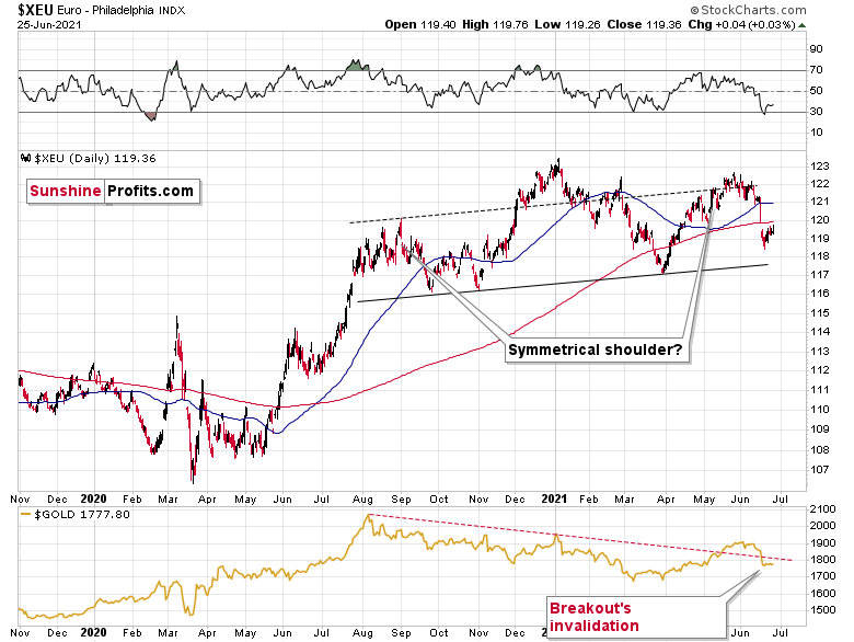 Moving on to the Euro Index, the recent symmetrical decline mirrors the drawdown that we witnessed in mid-2020. And if the Euro Index breaks below the neckline of its bearish head & shoulders pattern, the slide could be fast and furious. For context, completion of the right shoulder signals a decline to (roughly) the June 2020 lows or even lower. However, with a short-term corrective downswing in the USD Index likely to usher the Euro Index higher, the development should help support gold, silver, and mining stocks this week.