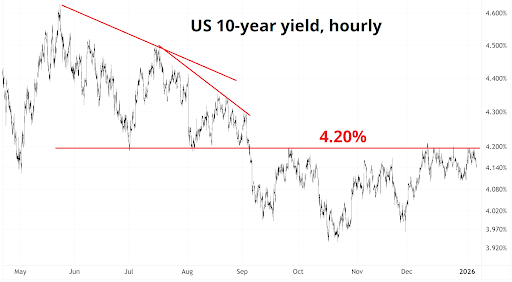 First up, just something to keep an eye on in bonds. After Liberation Day, US 10-year yields shot up to 4.50%/4.60% and then traded a 4.20%/4.60% range. In early September, 4.20% broke, and that has been the top of a new 3.90%/4.20% range ever since. With inflation coming in soft in Europe and Australia this week, could we be making another clear top and setting up for a move back down in yields?