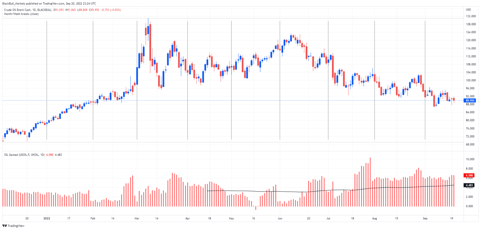 Brent Crude 1D, with WTI/Brent spread Indicator
