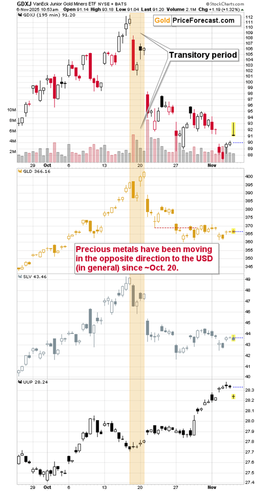 I’ve been writing for months that when the USD rally becomes clear, the precious metals market is likely to slide, and it looks like this is about to take place.