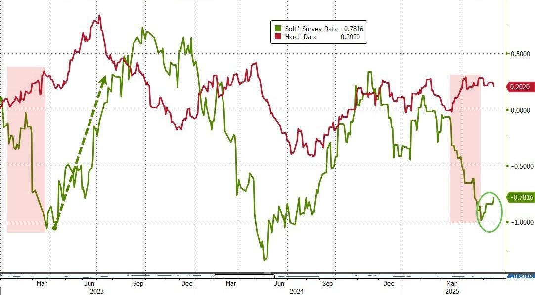 The long-running divergence between soft data (survey-based sentiment) and hard data (real economic output) is finally starting to close—but not in the direction the establishment PhD crowd promised. Instead of real activity rolling over to meet downbeat sentiment, it’s the surveys that are playing catch-up. The mood music is shifting. Business sentiment is perking up just as the actual economic data holds firm.