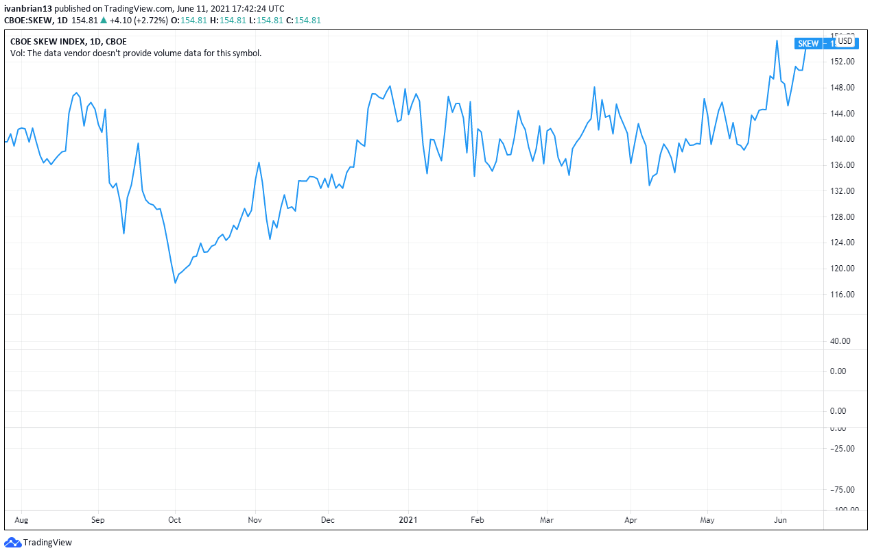 While the equity indices continue to grudgingly push higher many are either on the sidelines or actively seeking safety. The latest Refinitiv LipperAlpha flow data shows the S&P 500 ETF (SPY) losing nearly $2 billion in redemptions in the week to June 9. Conventional equity funds, those that are non ETF's also saw net redemptions to June 9, with nearly $3 billion being withdrawn from said equity funds. The latest SKEW data from the Chicago Board Options Exchange (CBOE) shows put buying on the equity indices close to record highs as investors look for downside protection or profit potential. Meanwhile, the market marches onwards and upwards.