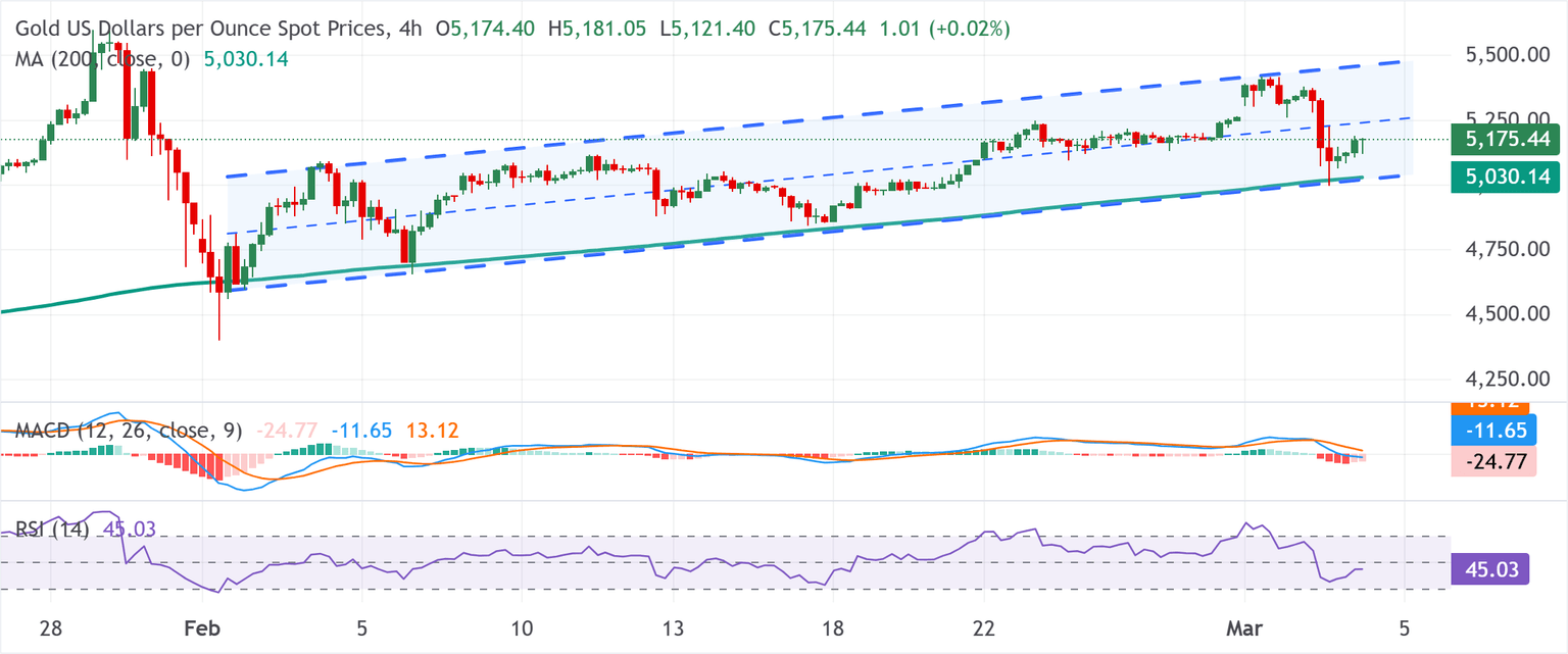 Gold holds inside an ascending parallel channel, hovering just above the lower boundary near $5,030, which keeps the broader pattern bullish despite the recent pullback from the $5,380-$5,410 area. Moreover, Gold prices still trade above the rising 200-period Simple Moving Average (SMA) on the 4-hour chart, around $5,030, keeping the medium-term uptrend intact.