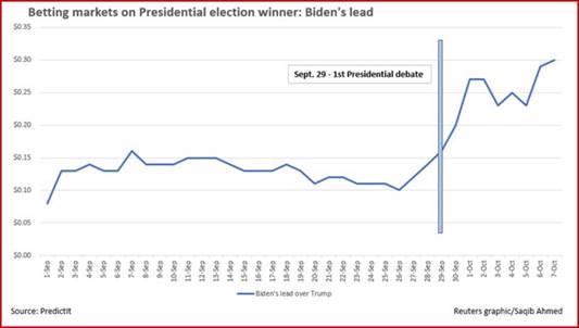 As shown in the PredictIt chart, the debate last week was a decisive loss for Trump. Reuters reports traders are banking on a Biden win, buying pot and solar stocks, while relaxing any impulse to buy dollars on the grounds volatility will not surge because a Biden win will be overwhelming. We say this is a dangerous attitude to take. He will not go quietly.