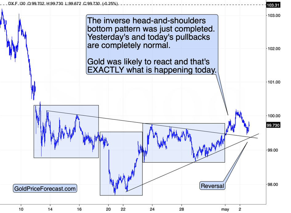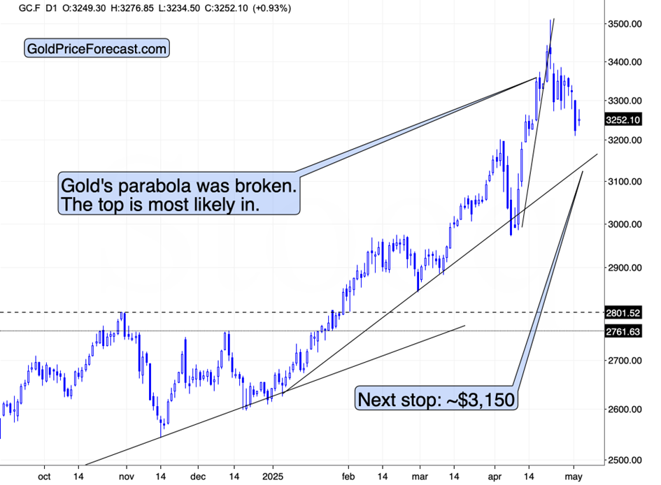 Gold price corrected a bit after breaking below the previous intraday lows. This consolidation is normal, and it’s unlikely to result in any meaningful rebound as no major support level was reached (except for the early April high, which was almost reached). Everything that I wrote about gold price forecast for May 2025 remains up-to-date. More importantly, however, the USD Index (to the rally of which gold reacted by sliding) didn’t encounter any particular resistance level.