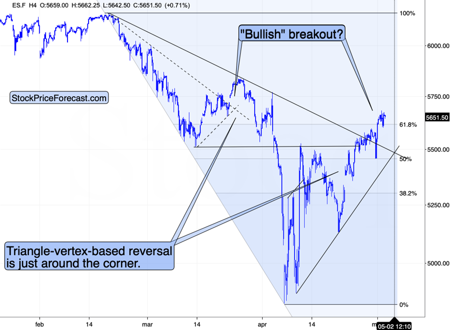 This pullback is completely natural, as the USDX just completed its inverse head-and-shoulders pattern. Corrections after those are common. And since the USDX just bottomed very close to the triangle-vertex-based reversal, it seems that the bottom here is in or about to be in. This, in turn suggests that the corrective upswing in gold and silver is about to be over. The same is likely for the stock market, which is likely also connected to the reversal in the USD Index, but in stocks’ case, there’s more to that.
