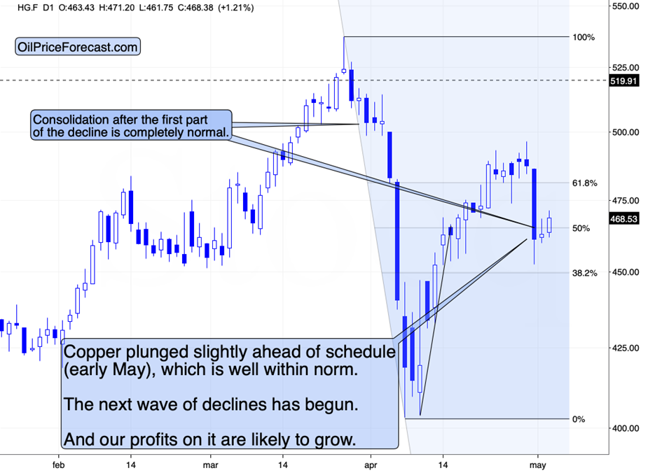 As I explained yesterday, the stock market has its own triangle-vertex-based reversal point, which is due early next week. Consequently, the current pause after a rally is quite natural. We’re still likely to get a (likely big) move lower next week. Besides, the decline in copper already indicated what’s likely next for stocks – it moves quite closely with the S&P 500, and it already declined significantly this week.