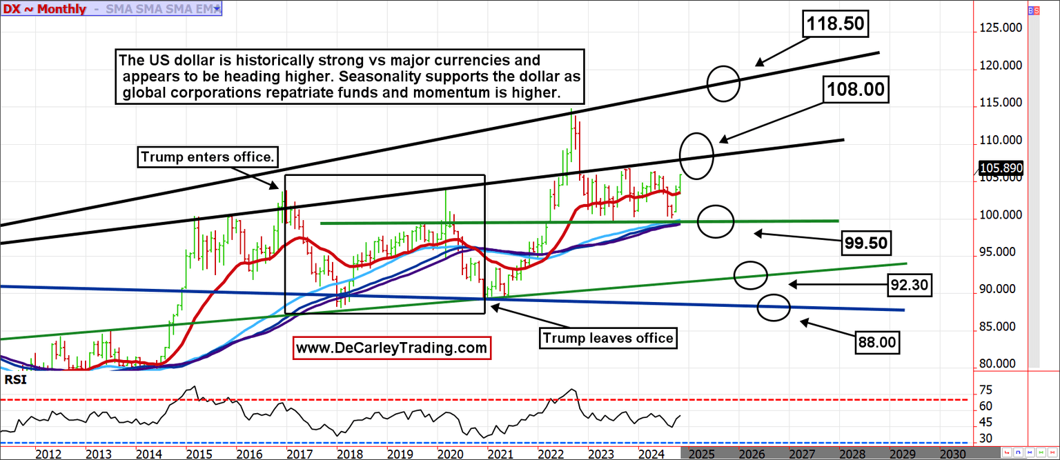 Seasonality is generally positive for the dollar, and momentum seems to point toward 108.00 on the index. Thus, we would expect the dollar rally to continue for the time being. However, the market is either over its skis or outright wrong about the Trump Presidency's impact on currencies. During the last Trump administration, the dollar depreciated. Even more compelling is that the depreciation took place despite the pandemic, which inflated the dollar. Perhaps this is why stock traders are ignoring the dollar rally, but it is more likely they are simply ignoring it and its implications which are poised to get worse before they get better.