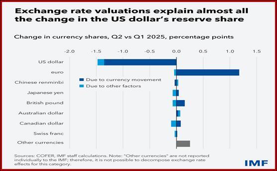 “At first glance, the raw data suggest a drop in the dollar’s share of allocated reserves to 56.32 percent at the end of the second quarter from 57.79 percent at the end of the first quarter, down 1.47 percentage points. However, by holding exchange rates constant, its share would have fallen only slightly to 57.67 percent.”