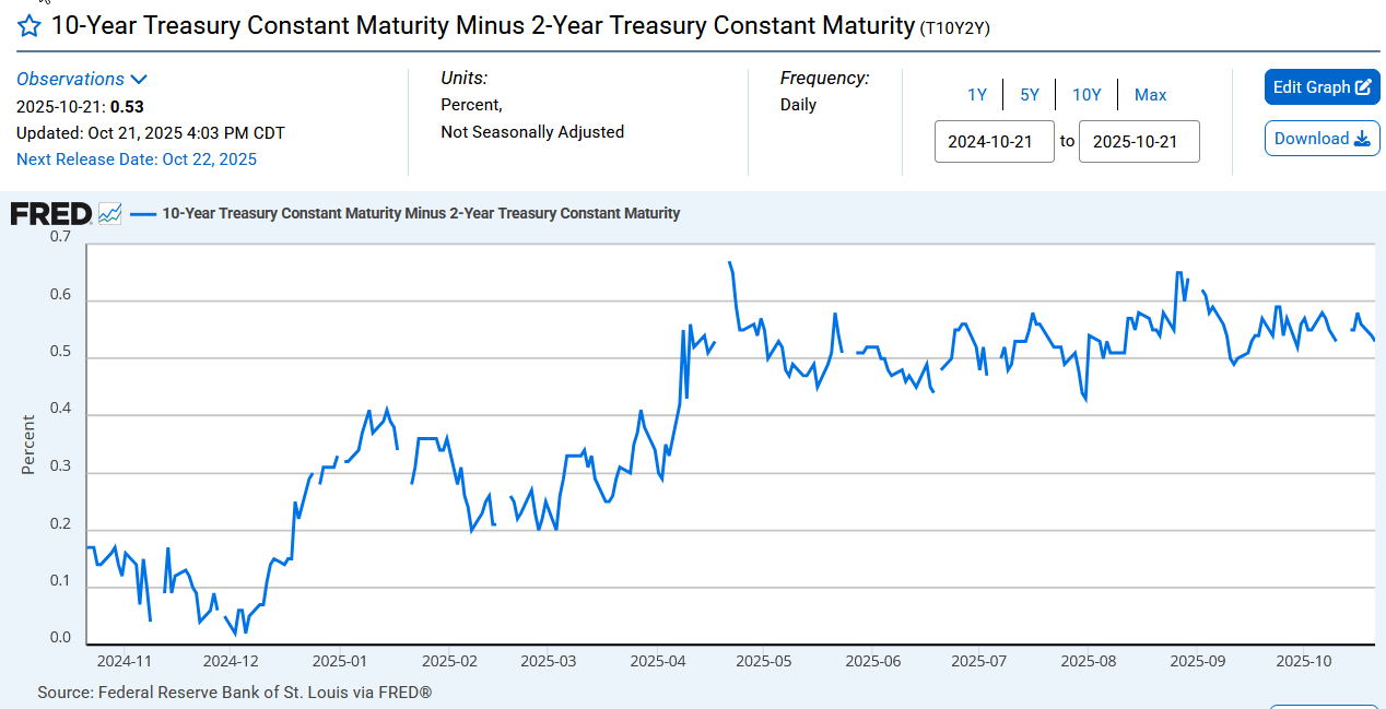 We await the US Sept CPI on Friday. Before then, the Treasury will auction a 20-year today. The 20-year yield has been falling since June—where are the bond vigilantes?—and the 2/10 spread has gyrating around 0.4-0.65% since May, after the leap on the start of the tariff war in April. See the chart from the St. Louis Fed.