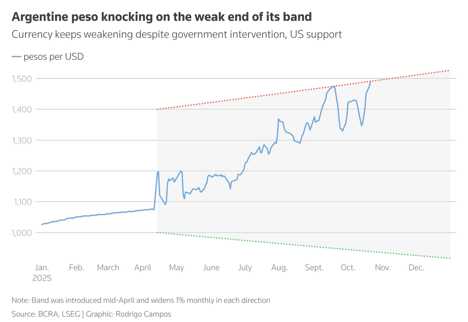 Tidbit: The US “rescue” of Argentina is not working. Reuters reports “Argentina's central bank sold $45.5 million from its reserves on Tuesday to support the exchange rate, after the peso reached the upper limit of the central bank's floating band despite U.S. support and a $20 billion currency swap to guarantee payment of the next public debt maturity. The intervention came as uncertainty in the market ahead of Sunday's legislative elections spurred a shift toward dollar assets.”