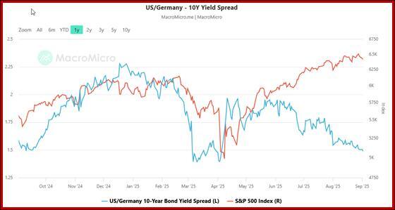We have noted before that the yield/dollar correlation is one of the better ones. See the Chart Package. Also, below is the US-Germany yield diff, showing a steep fall since he beginning of June. This site adds the S&P, which has continued to rise despite the drop in the differential. Somebody is sure to say this foretells a stock market correction—but the S&P has been rising for ten years come hell or high water, so probably not.