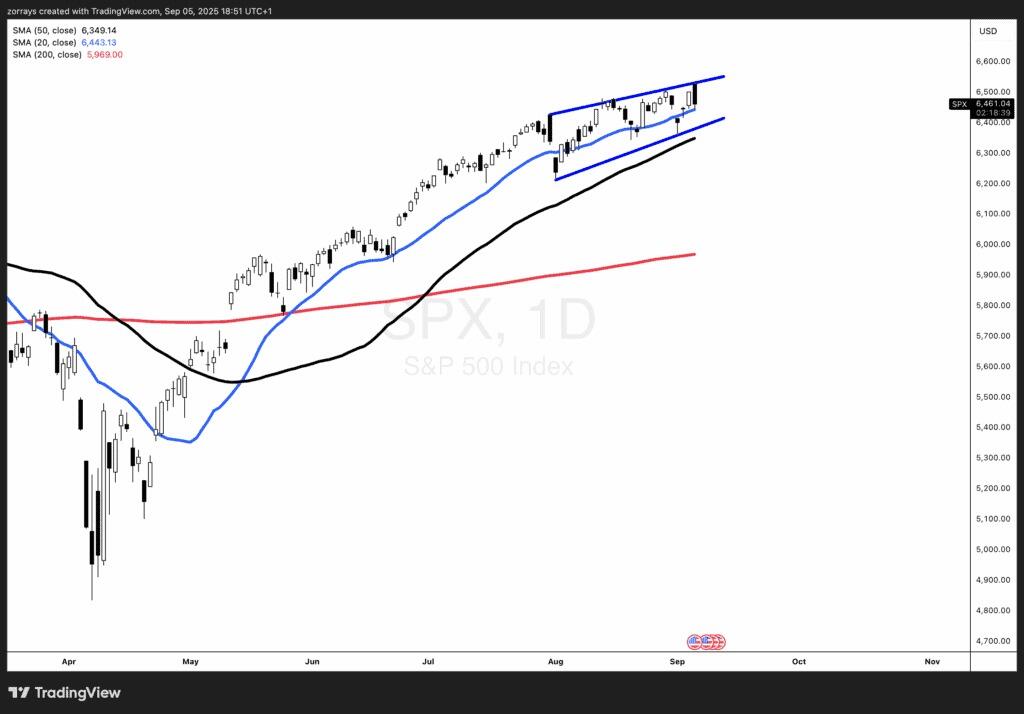 The S&P 500 (SPX) daily chart shows price action constrained within a rising wedge pattern. The index is trading above its 20-day (blue) and 50-day (black) moving averages, with the 200-day (red) far below at 5,969.