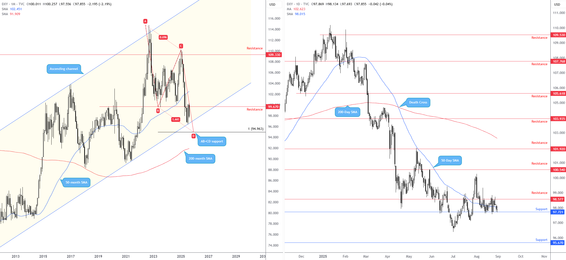 Technically, the USD index remains rangebound between daily support and resistance at 97.72 and 98.58. A breakout lower is bolstered by the fact that monthly flow recently rejected resistance at 99.67 and has room to reach for channel support, extended from the low of 72.70.