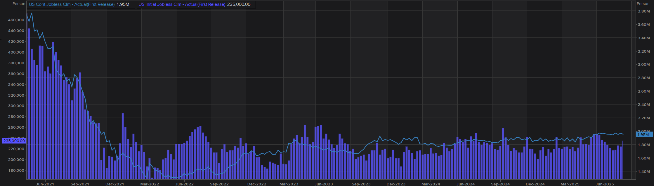 These estimates align with recent comments from Federal Reserve (Fed) officials, which highlighted that the US is in a ‘low hire, low fire’ mode. Additionally, this aligns with weekly jobless claims data. As shown on the chart below, although marginally off lows, unemployment claims are not signalling any red flags that suggest widespread layoffs. Continuing job claims further reinforce this picture, trending higher since bottoming out in 2022 and indicating that it is now proving more difficult to find employment.