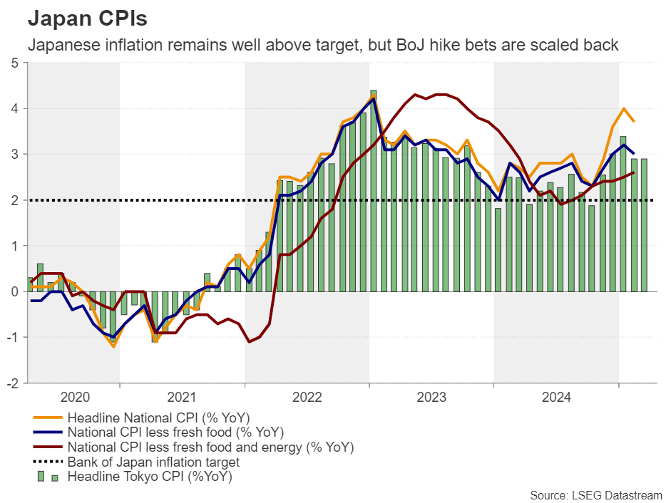 Bets that the BoJ will proceed with at least another 25bps rate hike this year have been scaled back due to the tariff-related market turbulence, with traders now pencilling only 10bps worth or rate increases by December. Even if the CPI data reveals some acceleration, it is very doubtful that the market will return to its pre-tariff state, when there was an 80% chance of a quarter-point hike in June. Yet, the yen seems to be enjoying some safe-haven inflows, with dollar/yen dropping to its lowest level since September.