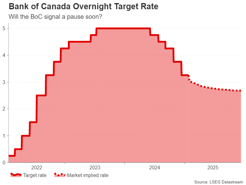 Hence, the BoC will probably prefer to keep its options open and merely signal a slower pace of easing going forward than a pause, which will not do the loonie any favours. But there could be some support for the currency from Thursday’s wage growth figures and Friday’s monthly GDP reading.