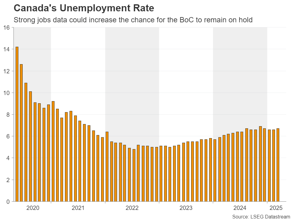 Investors are also confused about how the BoC may proceed, assigning a 60% chance for a rate cut at the next gathering, with the remaining 40% pointing to a pause. Therefore, should the employment data come in on the strong side, the likelihood of policymakers keeping their hands off the rate-cut button could increase, thereby adding more support to the surprisingly strong loonie.
