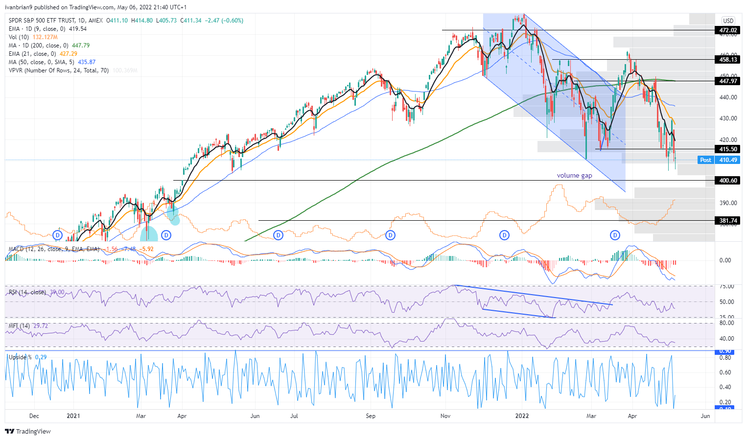 We remain with our sub $400 forecast. As mentioned CNN fear and greed index, AAII sentiment and Goldman Sachs sentiment are at peak fear or oversold levels. However to prevent everyone front running these metrics we called for a waiting game until the SPY really flushed everyone out. That is below $400 in our view and we are more or less there now. Then time for a hard and fast bear market rally. We do have a potential double bottom to watch at $405 but for now we stick with a bit more selling to really flush things out.