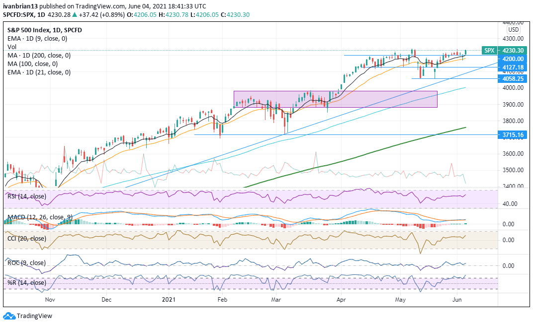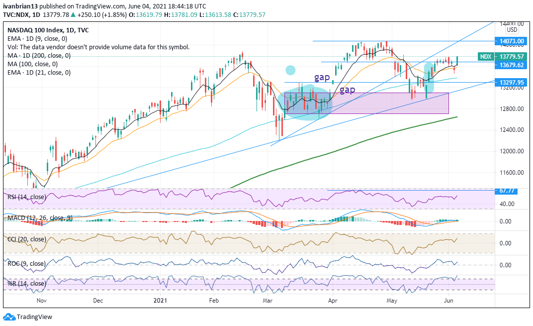 The Nasdaq has a bit more work to do and is at a small resistance 13,814, the high from May 07. This candle led to a sharp fall on May 08 and the Nasdaq has not retraced until now. A break of this level should help to retrace and test new record highs.