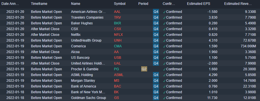 Massive slate again next week with Goldman leading the way on Monday. Bank stocks did not respond to earnings beats on Friday with Citi and JPM tanking so can Goldman buck the trend? We forecast a strong beat on top and bottom lines but are less sure of the short-term effect on the stock. Given today's pullback, we are likely to see a decent pop in premarket anyway but follow-through may be difficult. The strong background with IPO activity, M&A and stock buybacks all at record highs should help. Goldman topped the list in 2021 for M&A deals as well as IPO listings so the last quarter will reflect that performance. Netflix (NFLX) kicks off tech earnings season and it reports after the close on Thursday.