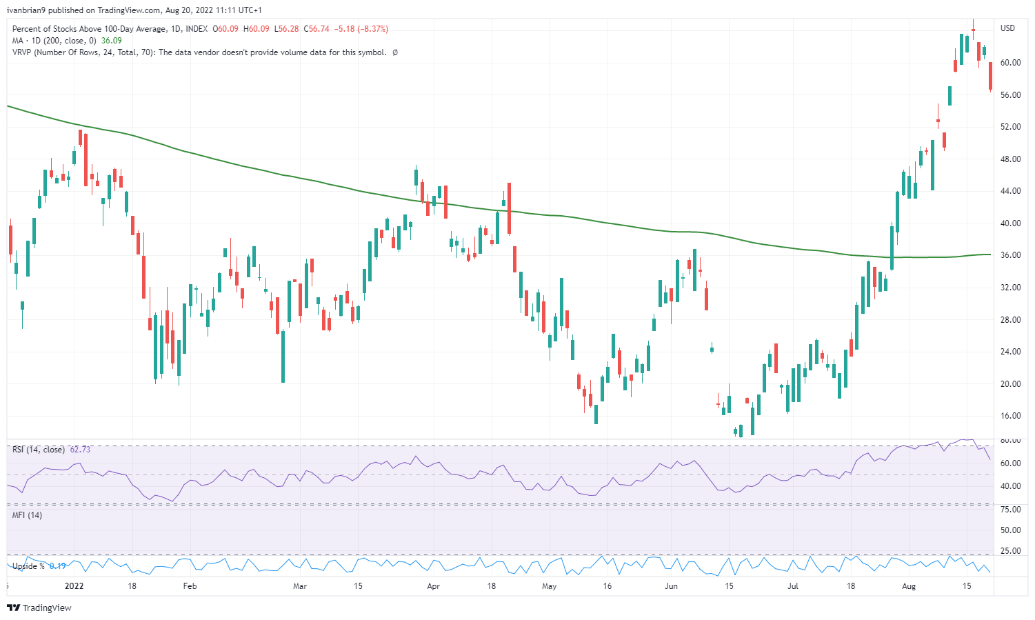 The rally so far has stalled out at the 200-day moving average in a near-perfect retracement from that level. The first support is the gap open at $417. Holding this keeps our short-term bullish. The lower chart shows us just how severe this rally has become with the number of stocks above the 100-day moving average moving from 13.6% to 65.4% in two months! Seems likely that a stall would have to happen.