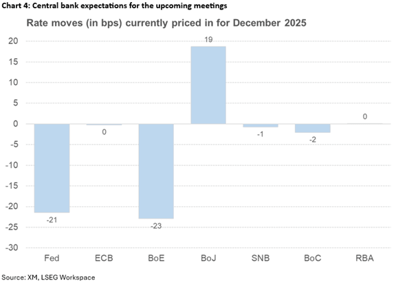 On Wednesday, the focus will also be on the dot plot and overall meeting rhetoric. In September, the dot plot projected three rate cuts by the end of 2026, one more cut than in June. With the market currently pricing in 63bps of easing during 2026, there is a decent chance of the three rate cuts penciled for next year, making it the baseline scenario for the Fed.