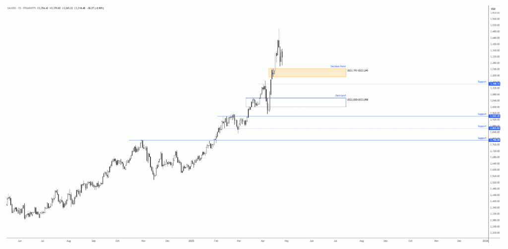 Gold has gained considerably in the last few years, and, as investors seek refuge in this go-to safe-haven asset amid trade concerns, it is up 26% this year after recently reaching all-time highs of US$3,500. Consequently, I believe many continue to view the yellow metal as a dip-buyers’ market. With price now within touching distance of a daily decision point area between US$3,193 and US$3,245, this could be a zone that trend followers closely monitor. However, it is worth pencilling in the possibility of a whipsaw through the aforementioned decision point base into support from US$3,148.