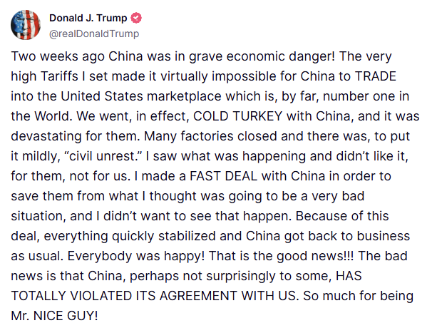 It did not end there. Adding to the week's trade tensions, Trump also targeted China on Friday. In a social media post, he noted that he made a ‘FAST DEAL’ with China, and that they have ‘VIOLATED ITS AGREEMENT’. As you can see from the screenshot below, Trump did not provide specifics about what the agreement entailed.
