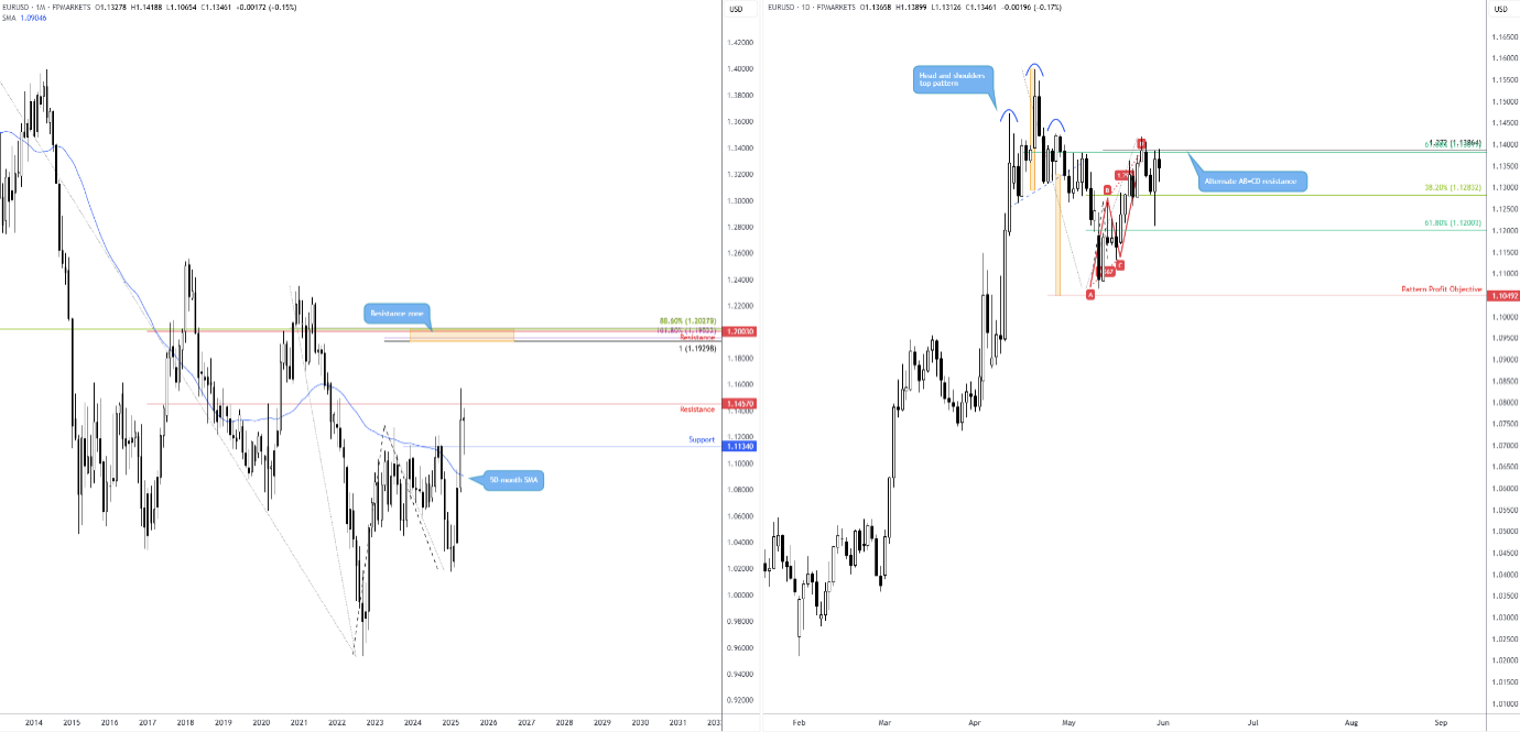 Technically, I remain EUR bullish versus the USD in the medium term. As shown on the charts below, price action on the monthly timeframe witnessed resistance at US$1.1457 enter the fray. This triggered a subsequent retest of support from US$1.1134, which, as you can see, held firm in May. Given this, US$1.1457 is perhaps vulnerable to the upside, targeting resistance between US$1.2028 and US$1.1930.