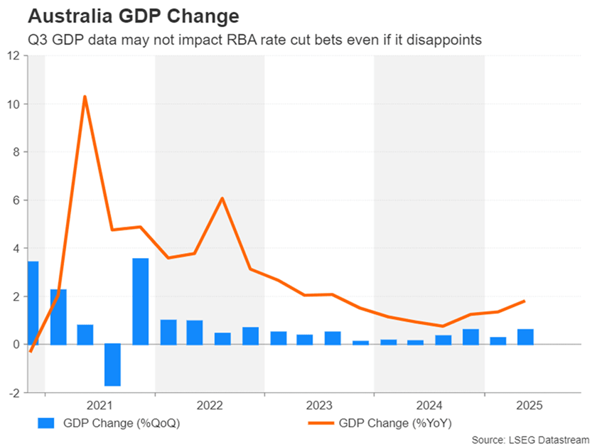 Combined with signs of a recovery in the labour market, there’s very little prospect of the RBA trimming rates again anytime soon. Hence, Wednesday’s GDP figures for the third quarter are unlikely to alter those expectations much even if they disappoint.