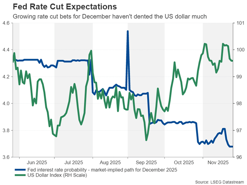 After a string of hawkish remarks by numerous Fed speakers, the doves made a comeback during the past 10 days, putting a rate cut at the December meeting back on the table. This lifted the odds of a 25-bps reduction on December 10 from around a quarter to almost 80%, in a dramatic reversal that reverberated across financial markets. Treasury yields sank, the US dollar not so much, but risk assets were propelled higher, with Wall Street and cryptocurrencies in particular recouping a chunk of their November losses.
