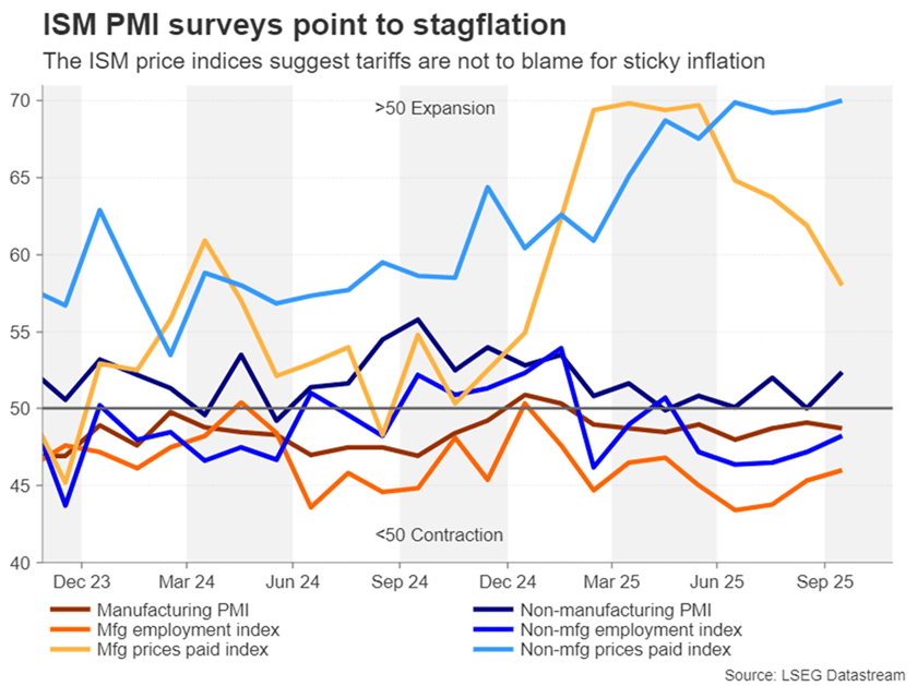Employment has also been declining, with the sub-index printing below 50 since February. However, the price index has plunged from close to 70.0 to 58.0 in October, casting doubt on the claim that tariffs have been inflationary. What’s worrying, though, is that the equivalent gauge for the services sector has stayed elevated near 70.0, suggesting that domestic price pressures are to blame for the country’s inflation rate being stuck within the 3.0% vicinity.