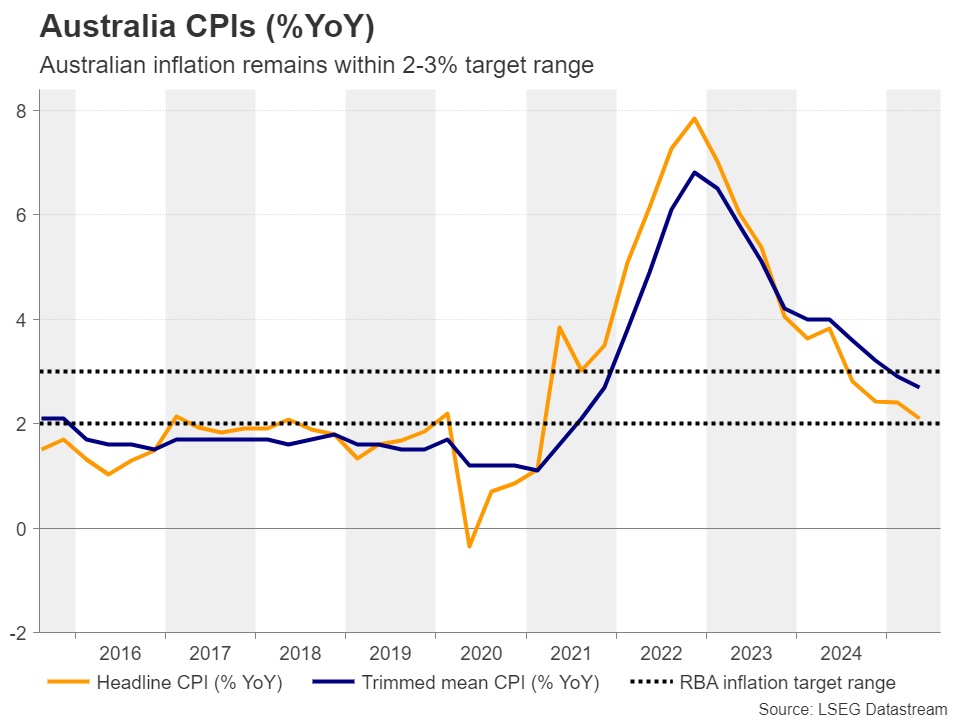 Apart from the US data, there is also a central bank decision on next week’s agenda. On Tuesday, the Reserve Bank of Australia (RBA) is widely anticipated to reduce interest rates by 25bps, while another 60bps worth of reductions are factored in by June 2026.