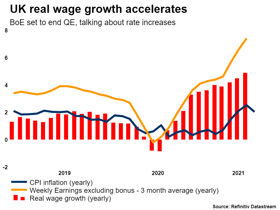 Speaking before lawmakers this week, Andrew Bailey essentially said his central bank was split 4-4 at its last meeting on whether the minimum conditions for a rate increase had already been met. This revelation suggests markets may be underestimating how quickly the first hike will be delivered. A quarter-point rate increase is currently priced in for next August.