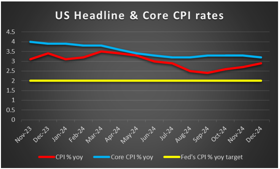 On a monetary level, we note ECB’s intentions to cut rates further and Trump’s intentions to impose tariffs on Euro Zone products could act as an accelerator for the bank’s rate cutting path. For the time being the market seems to expect the bank to deliver another three rate cuts in its following consecutive meetings until June. Overall any signals by the bank verifying or even enhancing the market’s expectations could weigh on the EUR. On the flip side inflation in the Zone may not be easing as planned by the bank which could force it to ease on its rate cutting path and such a scenario to provide support for the common currency.