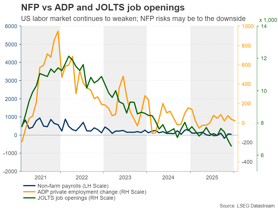 A report contrasting Fed Chair Powell’s view that the downside risks to the labor market are diminishing could prompt investors to add to their rate cut bets and thereby bring the US dollar under some selling pressure.